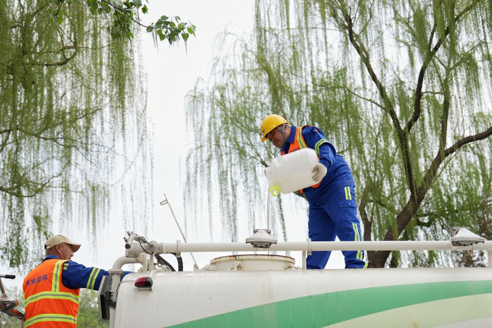 4月9日,北京的园林工作人员在喷水车内添加凝絮剂,准备进行喷水作业。新华社记者 鞠焕宗 摄