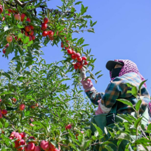 2024年9月12日,在内蒙古通辽市科尔沁左翼中旗希伯花镇,果农采摘锦绣海棠果。在科尔沁左翼中旗,以锦绣海棠为代表的经济林已成规模,其防风固沙、水土保持等生态效益逐渐显现,农牧民来自经济林的收入也不断增长。新华社记者 连振 摄