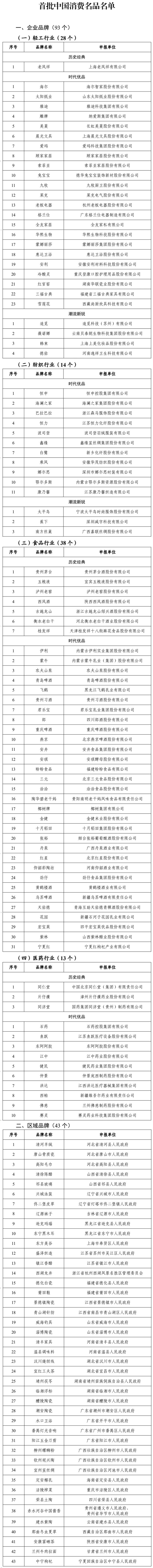 新华社北京4月11日电(记者周圆、张辛欣)记者11日从工业和信息化部获悉,为贯彻实施中办、国办印发的《提振消费专项行动方案》,工业和信息化部近日发布首批中国消费名品名单,包括企业品牌93个、区域品牌43个,还公布了中国消费名品成长企业42家。