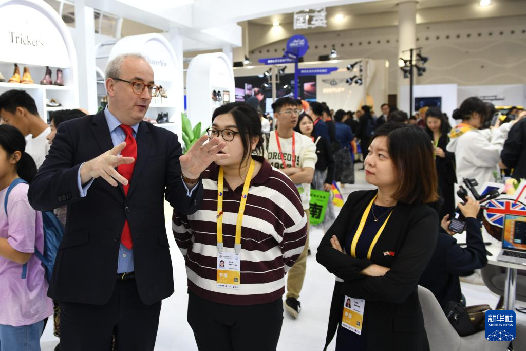 4月13日,外方人员在第五届消博会英国国家馆与中方工作人员交流。新华社记者 孙笑天 摄