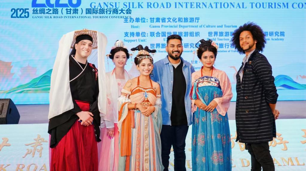 4月7日,在2025丝绸之路(甘肃)国际旅行商大会上,旅行博主帕维特拉·拉玛达斯(右二)等与会者一同拍照留念。新华社发