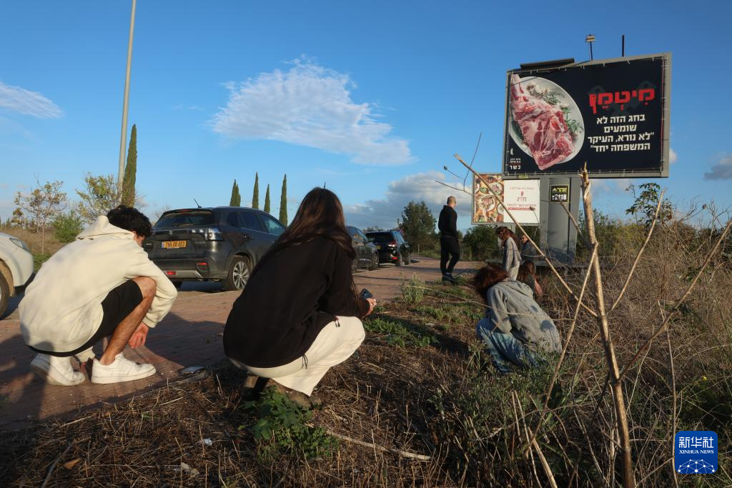 4月13日,在以色列莫迪因,人们在防空警报响起后蹲在路边避险。新华社发(吉尔·科恩·马根摄)