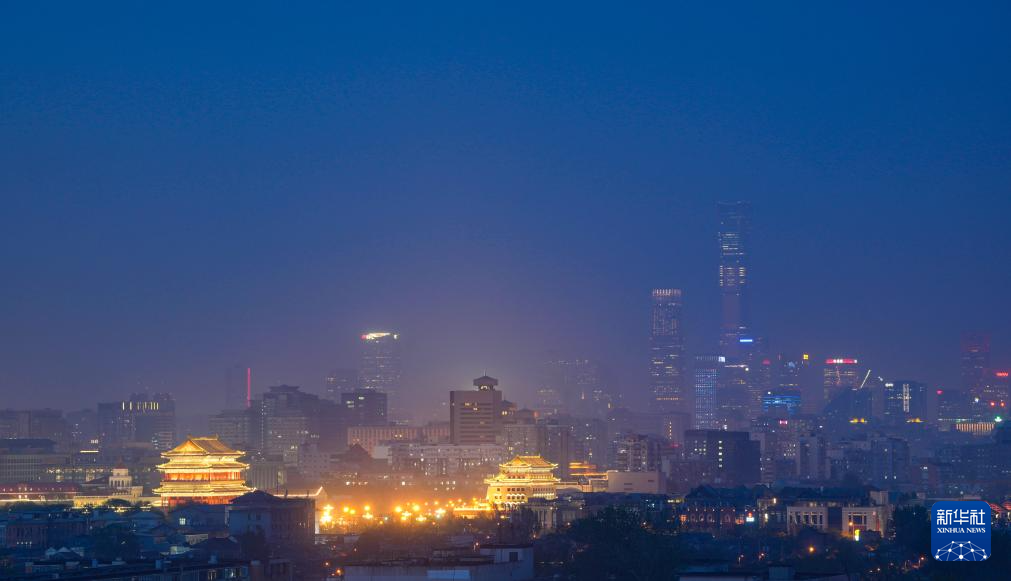 北京日落后的正阳门城楼、箭楼和远处的CBD建筑群(4月14日摄)。新华社记者 陈晔华 摄