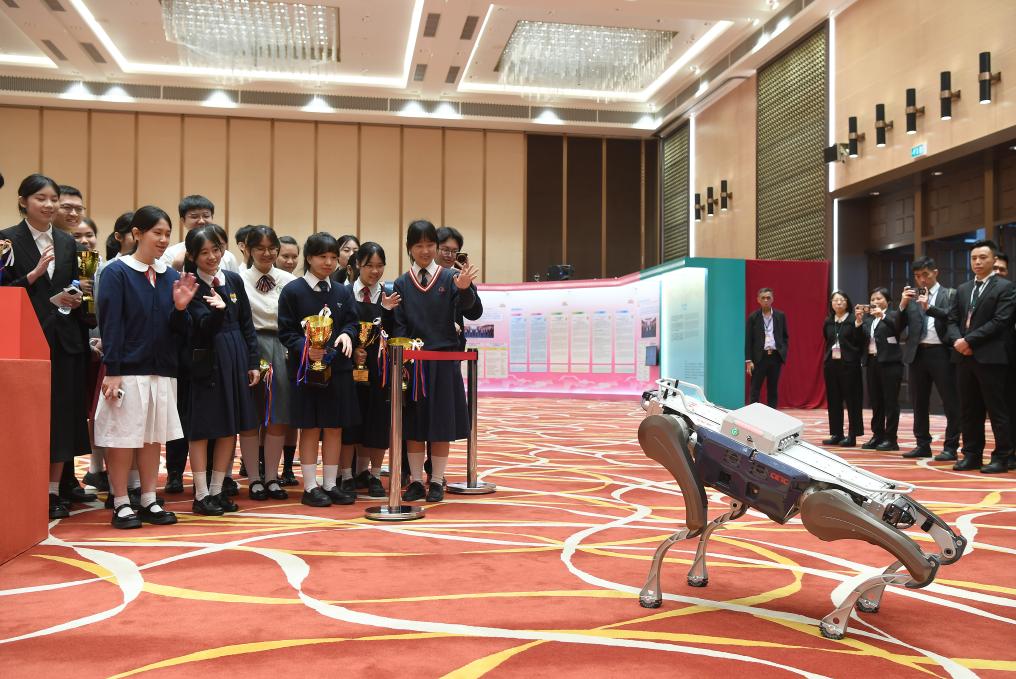 4月15日,学生在由澳门特区政府与澳门中联办合办的“全民国家安全教育展”上观看智能四足机器人。新华社记者 陈铎 摄