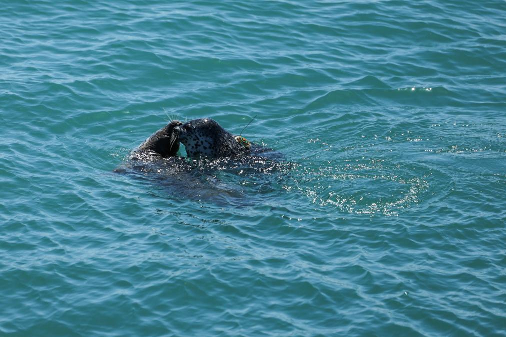 2024年4月16日,被放归的西太平洋斑海豹在辽宁大连市旅顺口区附近海域活动,一只斑海豹身上的信标露出水面。新华社记者 潘昱龙 摄