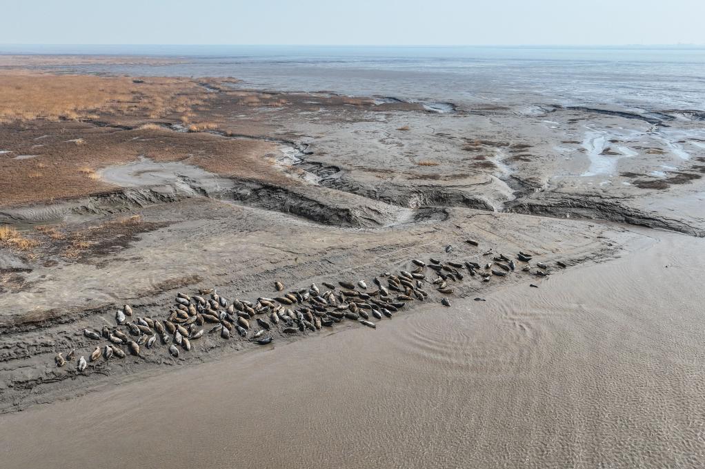 2024年4月9日,西太平洋斑海豹在辽宁盘锦三道沟海域的滩涂上休息(无人机照片)。新华社记者 潘昱龙 摄