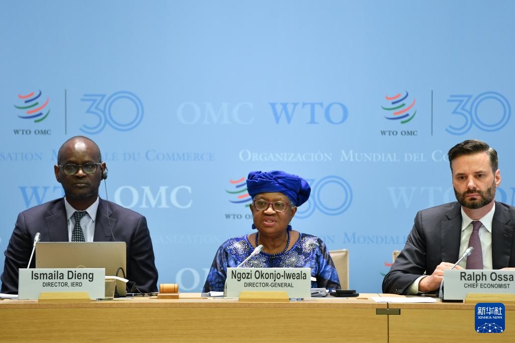 4月16日,在瑞士日内瓦世界贸易组织总部,世贸组织总干事伊维拉(中)在新闻发布会上讲话。新华社记者 连漪 摄