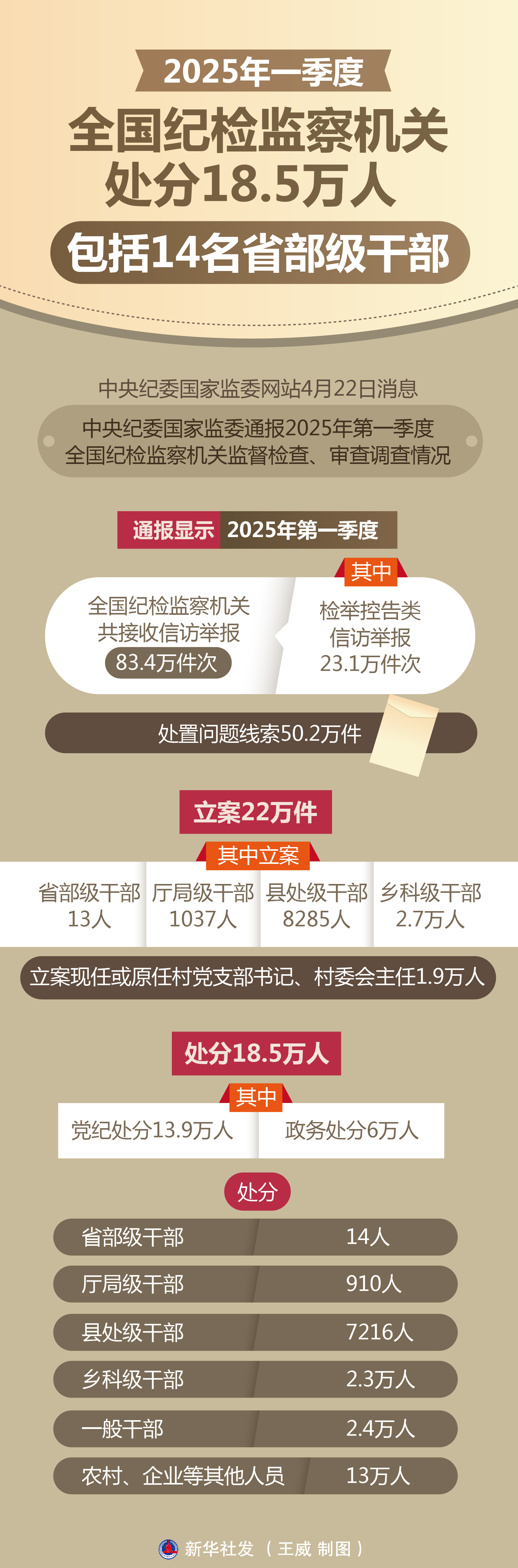 通报显示,2025年第一季度,全国纪检监察机关共接收信访举报83.4万件次,其中检举控告类信访举报23.1万件次。处置问题线索50.2万件。立案22万件,其中立案省部级干部13人、厅局级干部1037人、县处级干部8285人、乡科级干部2.7万人;立案现任或原任村党支部书记、村委会主任1.9万人。处分18.5万人,其中党纪处分13.9万人、政务处分6万人;处分省部级干部14人,厅局级干部910人,县处级干部7216人,乡科级干部2.3万人,一般干部2.4万人,农村、企业等其他人员13万人。