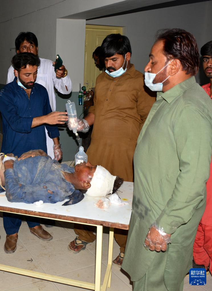 4月22日,在巴基斯坦南部信德省贾姆肖罗地区,救援人员将一名交通事故中的伤者送到医院。新华社发
