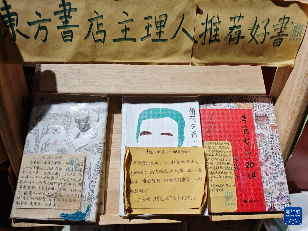 暮色四合,东方书店的霓虹灯牌亮起。一位母亲牵着孩子在书架前驻足,孩子踮脚取下一本《朝花夕拾》,书的封面上粘贴着书店主理人书写的一段读书短评。