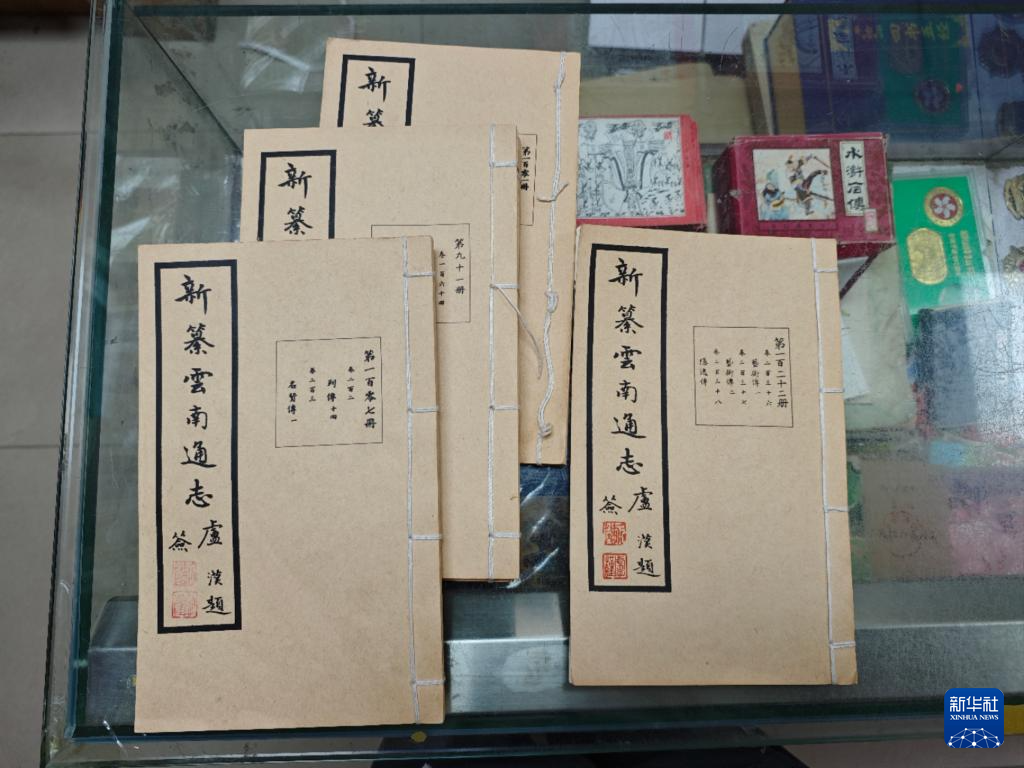 4月23日,在书必银书行内的书架上陈列着线装版《新纂云南通志》。新华社记者胡了然 摄