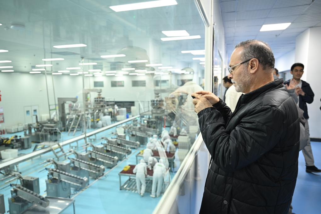 4月26日,外宾在参观位于喀什的一家农业科技有限公司时拍照记录工厂生产线。新华社记者 辛悦卫 摄