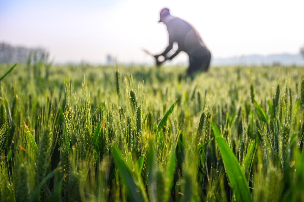 4月20日,在河南省商丘市夏邑县会亭镇郭楼村,村民在麦田内除杂 新华社发(王高超摄)