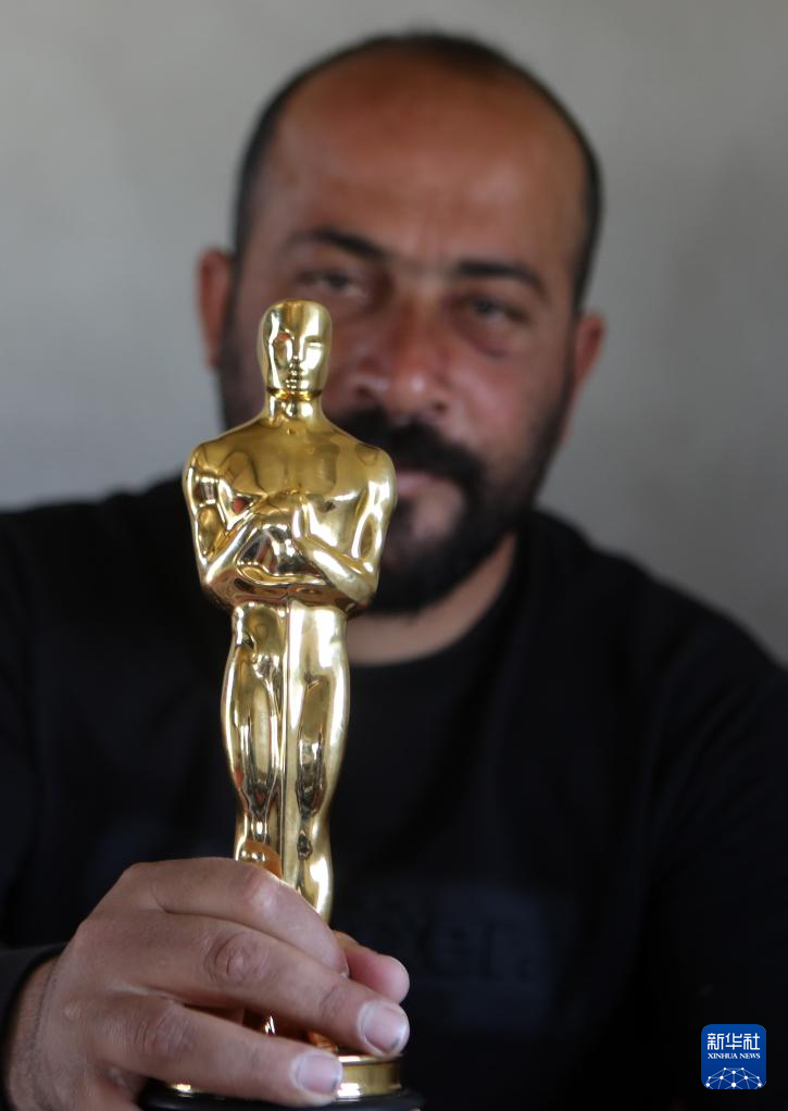 3月26日,在约旦河西岸南部马萨费尔亚塔地区,巴勒斯坦导演哈姆丹·比拉勒展示他的奥斯卡奖杯。新华社发(马蒙·沃兹沃兹摄)