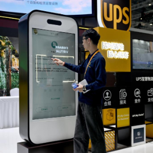 2024年11月5日,工作人员在第七届中国国际进口博览会服务贸易展区美国联合包裹运送服务公司展台展示智慧物流解决方案。新华社发(陈浩明摄)