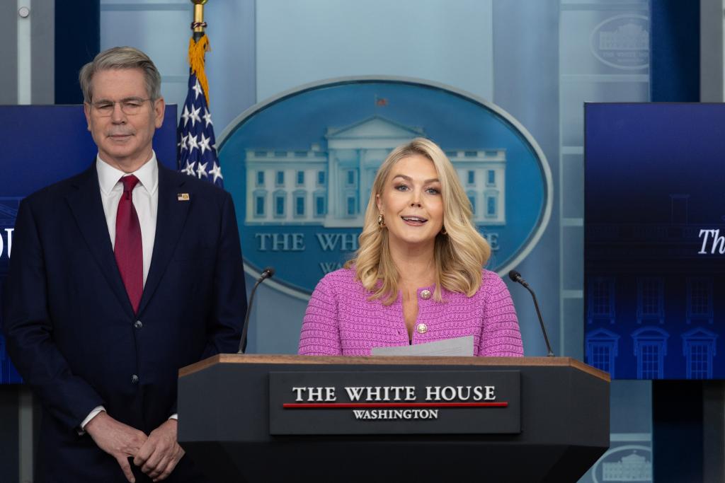 4月29日,美国白宫新闻秘书莱维特(右)与财政部长贝森特在白宫出席记者会。莱维特批评报道中有关亚马逊计划就商品售价标注加征关税成本的做法是“敌对且政治化的行为”。新华社记者胡友松摄