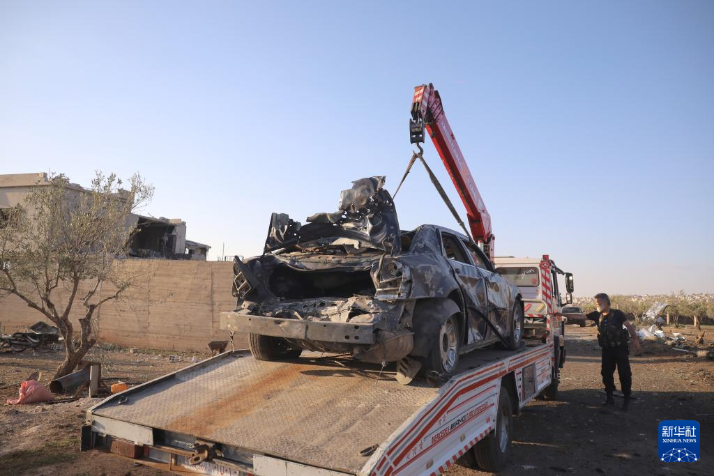 5月2日,在叙利亚南部苏韦达省,工程车辆吊起一辆在以色列空袭中损毁的汽车。据叙利亚通讯社2日报道,叙南部苏韦达省卡纳克尔镇当天遭到以色列空袭,导致4名平民死亡。新华社发
