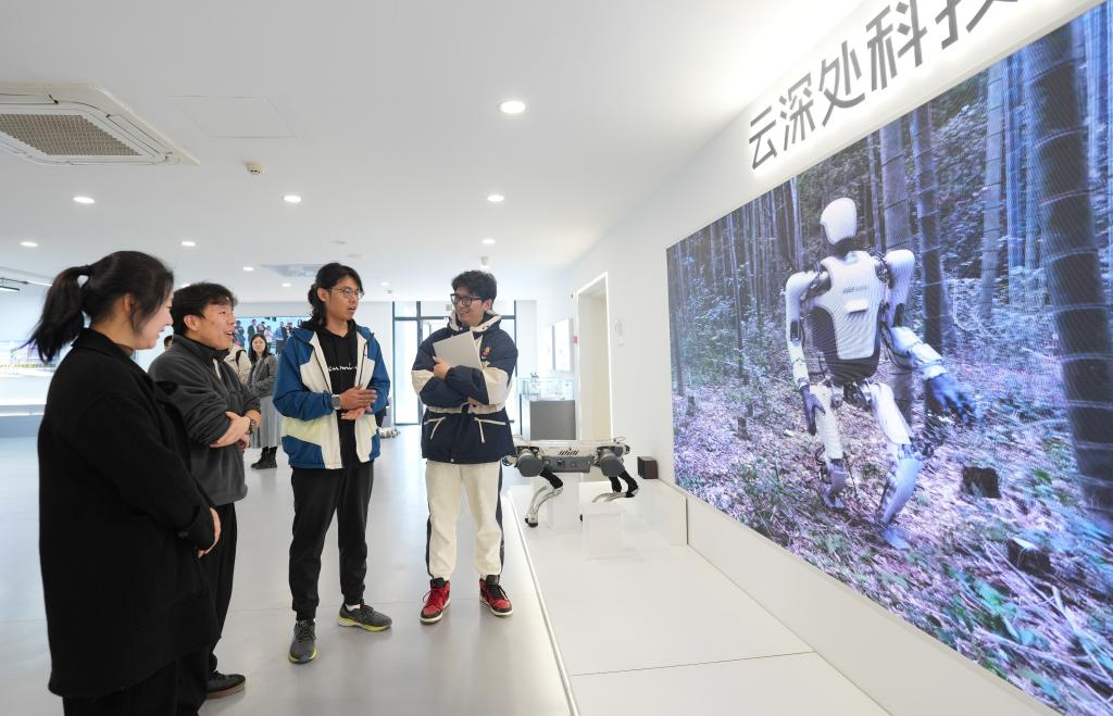 2月28日,“00后”杭州云深处科技有限公司技术支持团队工程师杨俊(右二)和同事在公司为客户介绍一款人形机器人的应用。新华社记者 翁忻旸 摄