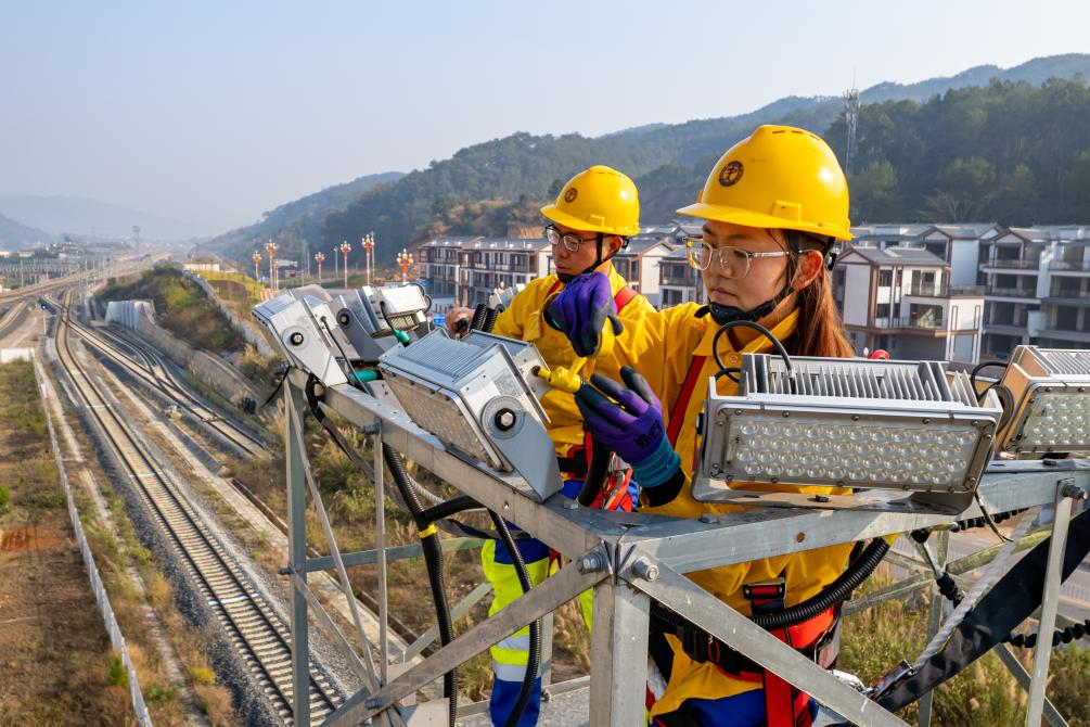 3月7日,中国铁路昆明局集团有限公司“00后”女电工王华钦(右一)在中老铁路宁洱站货运场检修灯塔(无人机照片)。新华社发(殷学合 摄)