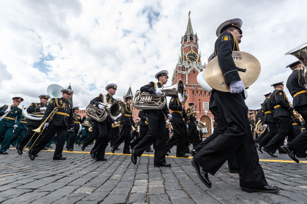 2022年5月9日,在俄罗斯莫斯科,军乐团准备参加纪念卫国战争胜利77周年阅兵式。新华社记者 白雪骐 摄