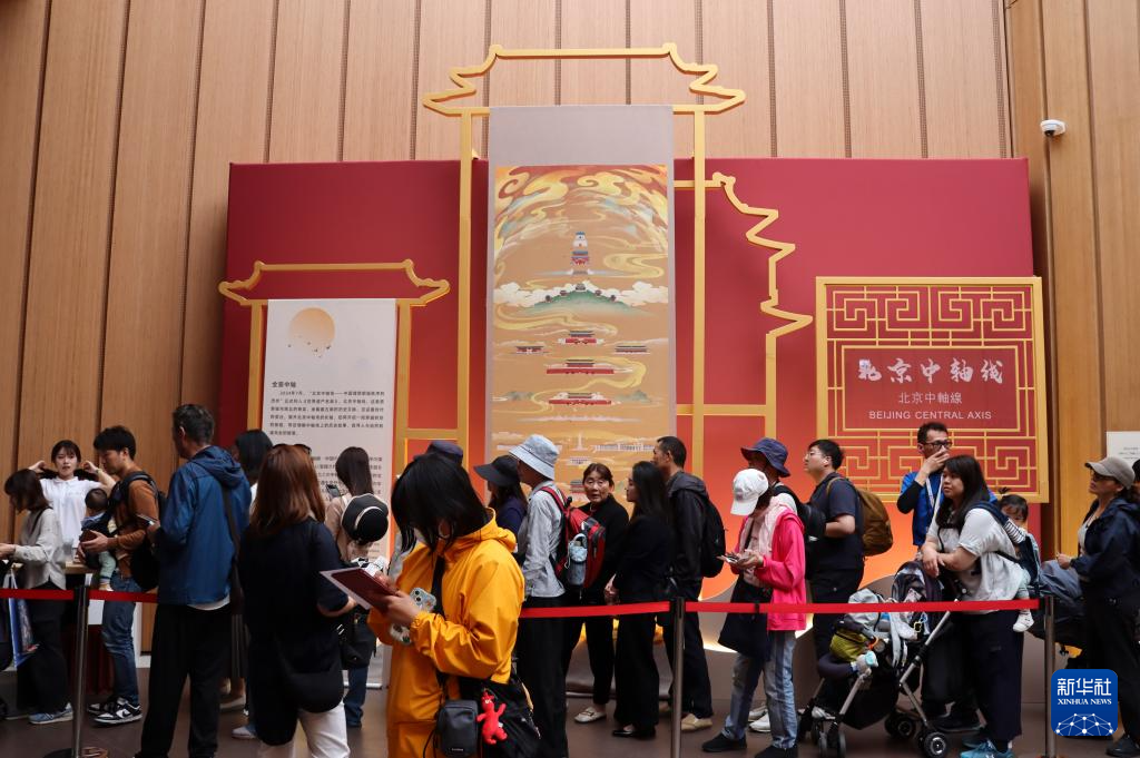 5月8日,观众在日本大阪世博会北京活动周现场的北京中轴线文化展区排队打卡盖章。新华社记者 胡晓格 摄