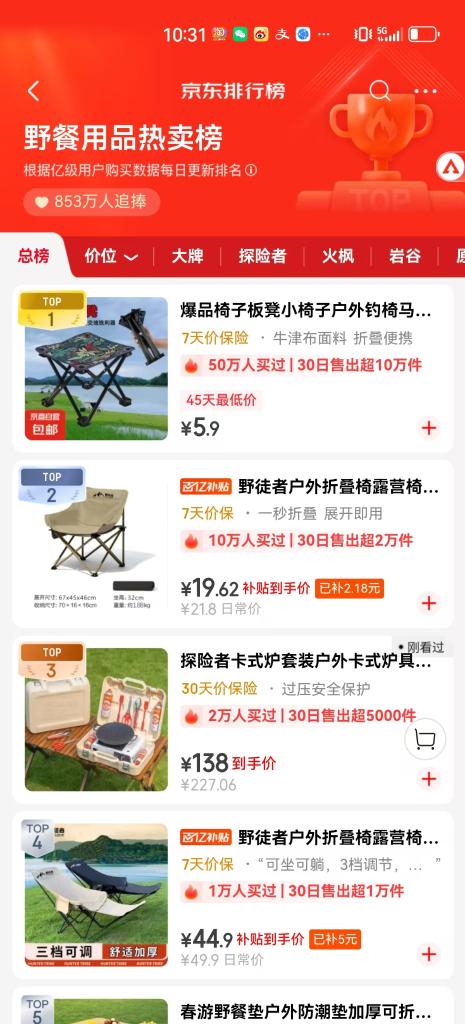 记者登录某电商平台看到,卡式炉产品在“野餐用品热卖榜”等榜单上名列前茅,品牌主推产品普遍销量过万,最畅销的一款产品销量超过20万,不同品牌卡式炉价格从几十元到数百元不等,气罐价格在10元上下,商家多以“露营野餐必备”“烧烤火锅”“户外便携”等为卖点。