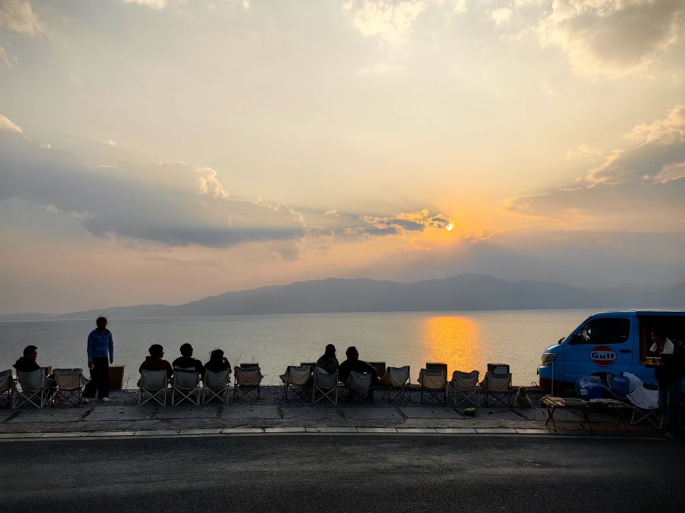 我曾路过抚仙湖畔的环山路,流动咖啡售卖车停在山腰,几把轻便户外椅随意摆放,人们捧着一杯咖啡,等待太阳缓缓坠入涌动的云层,天边如同被橘红色的流云轻轻覆盖,波光粼粼的湖面犹如丝绸一般。