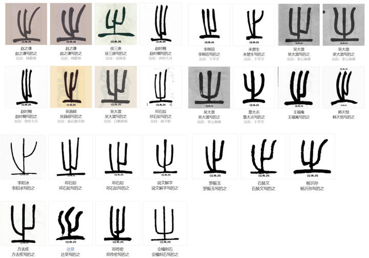 《说文》中许慎对小篆“之”的解释是:“象艸過屮,枝茎益大,有所之。一者,地也。”在许慎的描述中,小篆“之”字可以拆解为上部的“屮”和底部的“一”形横笔。