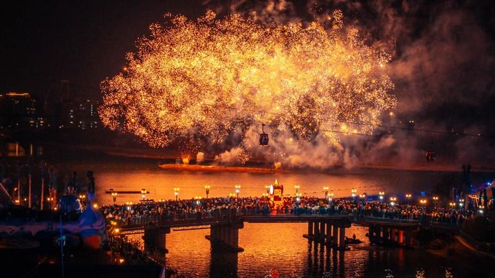 夜幕降临,上海海昌海洋公园“机甲大巡游”和“狂欢之海”电音节吸引了数万名游客;一抬眼,多彩的无人机变换队形,绚丽的烟花秀点亮夜空,与水面彩船交相辉映。