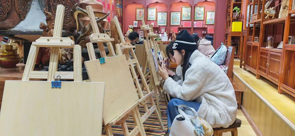 2025年3月6日,游客在独克宗古城里体验画唐卡。新华社记者浦超摄影