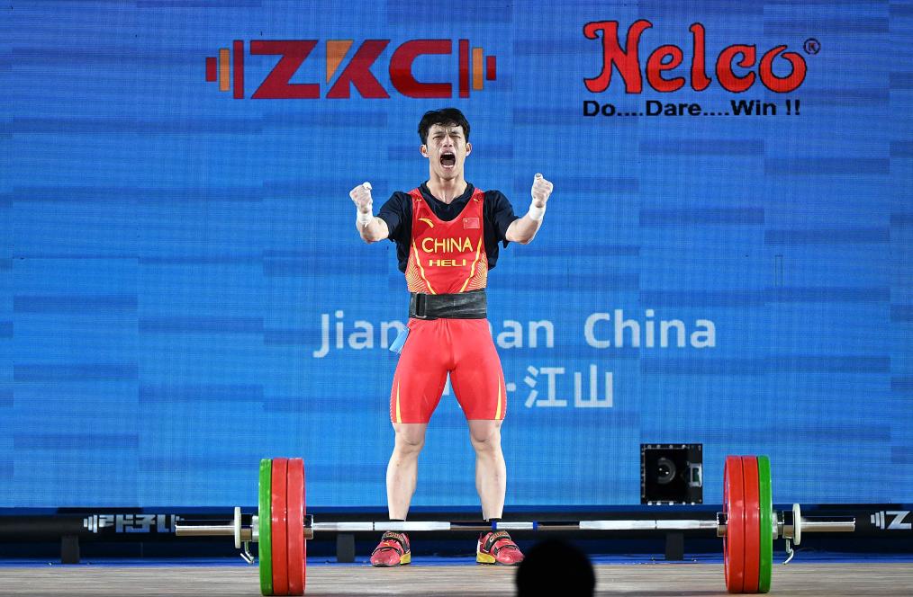 5月9日,中国选手王威东在比赛中庆祝试举成功。新华社记者 侯昭康 摄