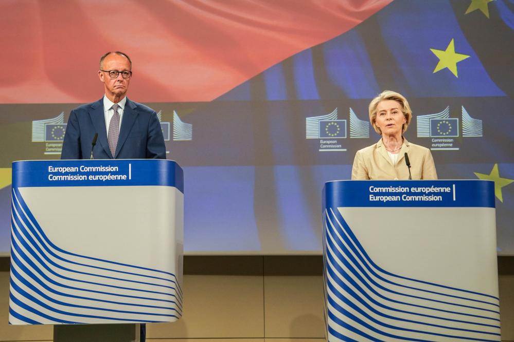 5月9日,在比利时布鲁塞尔,德国总理默茨(左)与欧盟委员会主席冯德莱恩一同出席新闻发布会。新华社记者 彭子洋 摄