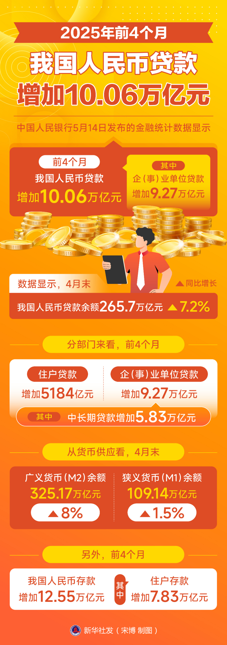 新华社北京5月14日电(记者吴雨、任军)中国人民银行14日发布的金融统计数据显示,前4个月我国人民币贷款增加10.06万亿元,其中企(事)业单位贷款增加9.27万亿元。