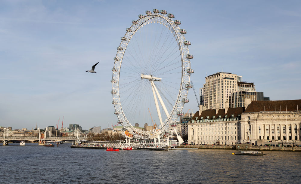 2024年1月28日,一只飞鸟飞过英国伦敦的伦敦眼。新华社记者 李颖 摄