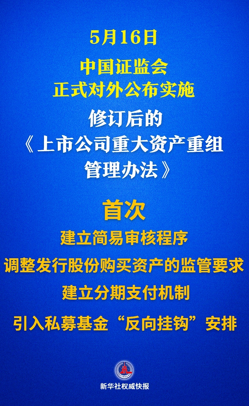 5月16日,中国证监会正式对外公布实施修订后的《上市公司重大资产重组管理办法》,在简化审核程序、创新交易工具、提升监管包容度等方面作出优化。