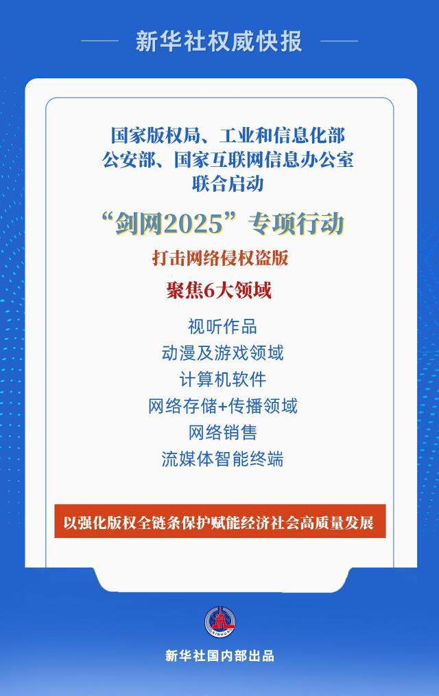 国家版权局、工业和信息化部、公安部、国家互联网信息办公室四部门近日联合启动打击网络侵权盗版“剑网2025”专项行动,这是全国持续开展的第21次打击网络侵权盗版专项行动。