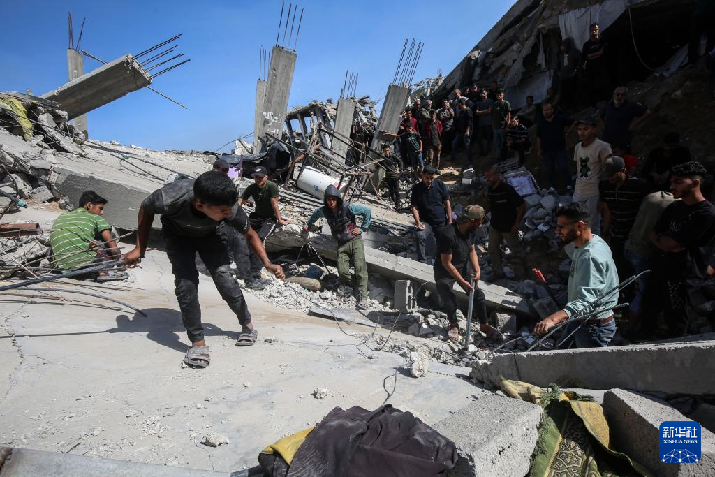 5月16日,在加沙地带北部杰巴利耶难民营,人们查看以军袭击后的建筑废墟。新华社发(里泽克·阿卜杜勒贾瓦德摄)