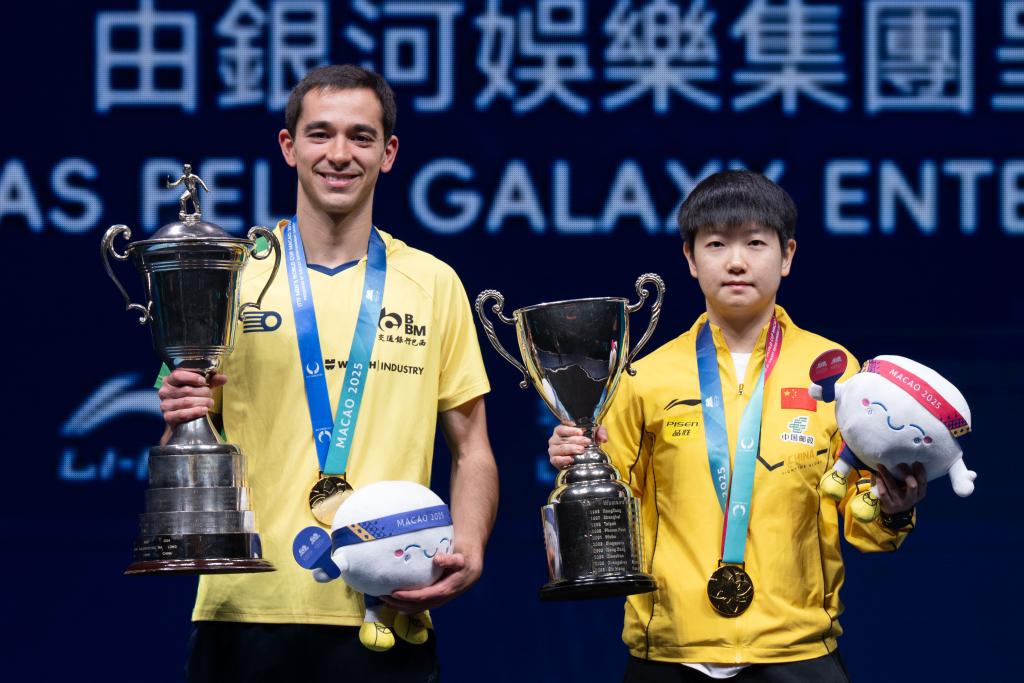 4月20日,孙颖莎(右)和男单冠军巴西选手雨果·卡尔德拉诺在颁奖仪式后合影。新华社发(张金加摄)