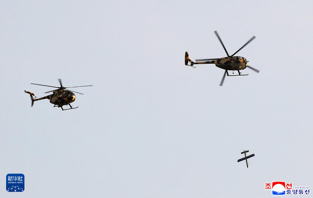 这是朝中社发布的朝鲜空军直升机进行攻击敌方无人机训练的画面。新华社/朝中社