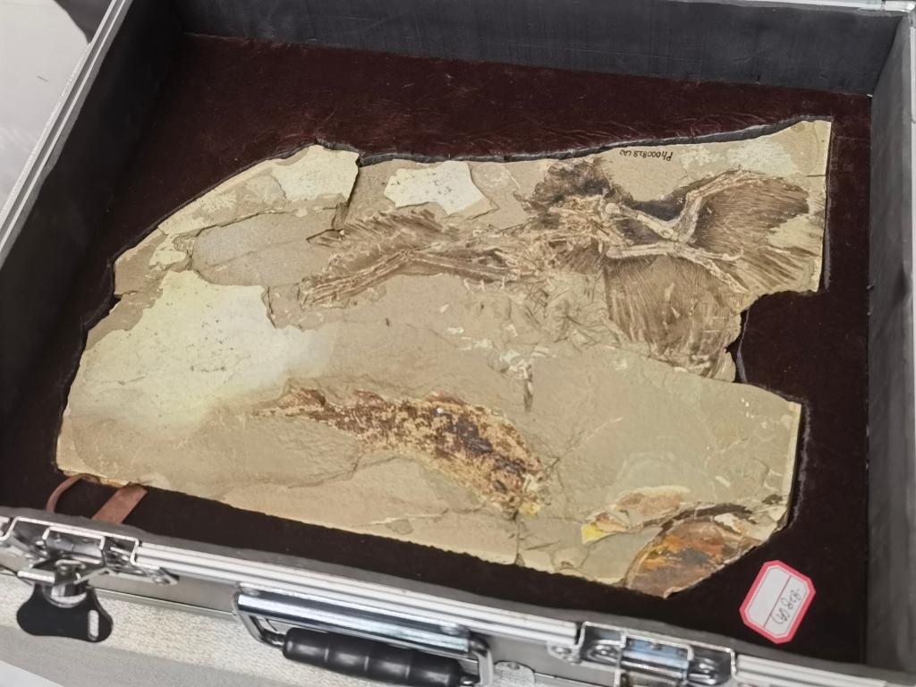 图为18日开箱的赫氏近鸟龙标本。新华社记者陈爱平摄