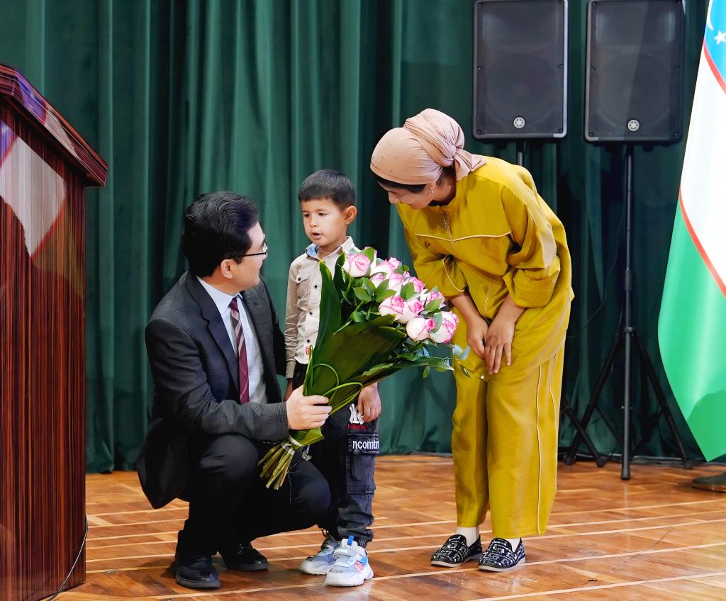 5月1日,在乌兹别克斯坦首都塔什干,阿齐兹及其母亲向中国医学科学院阜外医院副院长潘湘斌教授献花。数年前,潘湘斌教授团队为阿齐兹的母亲成功治疗了心脏病。新华社发