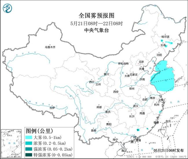 中央气象台5月21日06时继续发布大雾黄色预警: