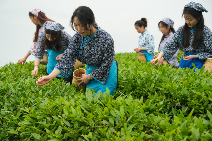 4月26日,在重庆市綦江区石角镇新农村,采茶姑娘在茶园内采摘鲜茶叶。新华社发(李晓果 摄)