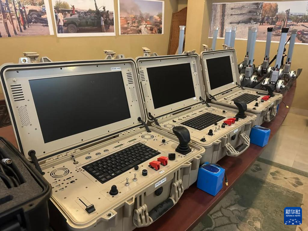 这是5月20日在苏丹首都圈恩图曼市南部萨勒哈地区拍摄的苏丹武装部队缴获的无人机系统组件。新华社发(苏丹文化和新闻部供图)