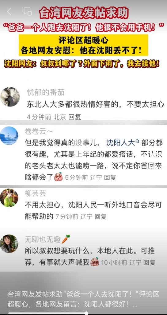 一个独自旅行的台湾大叔,一则跨越海峡的网络求助,开启了一场大陆网民的“温情守护”。