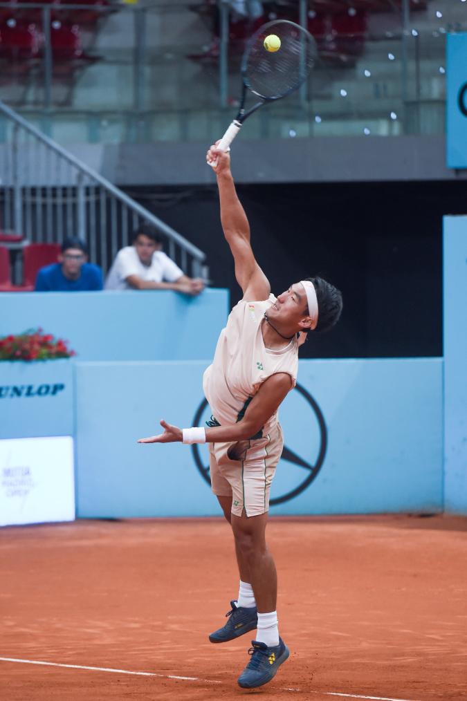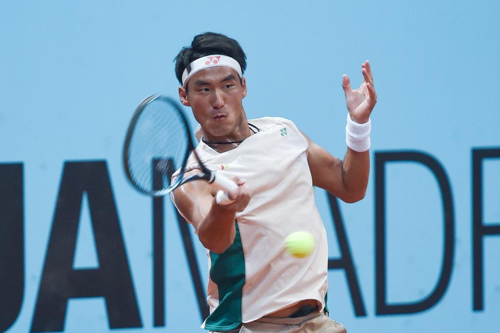4月24日,在2025马德里网球公开赛男子单打首轮比赛中,中国选手布云朝克特0:2不敌英国选手费恩利。新华社发(古斯塔沃·巴连特摄)