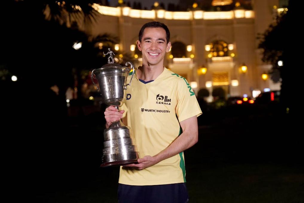 4月20日,雨果在澳门展示男子单打冠军奖杯。新华社发(国际乒联供图)
