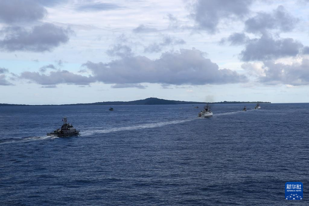 5月26日,中柬“金龙-2025”联演海空方向实兵演练在柬埔寨西哈努克港附近海空域举行,参演的中柬联合任务编队开展海上航渡训练。新华社发(甘俊 摄)