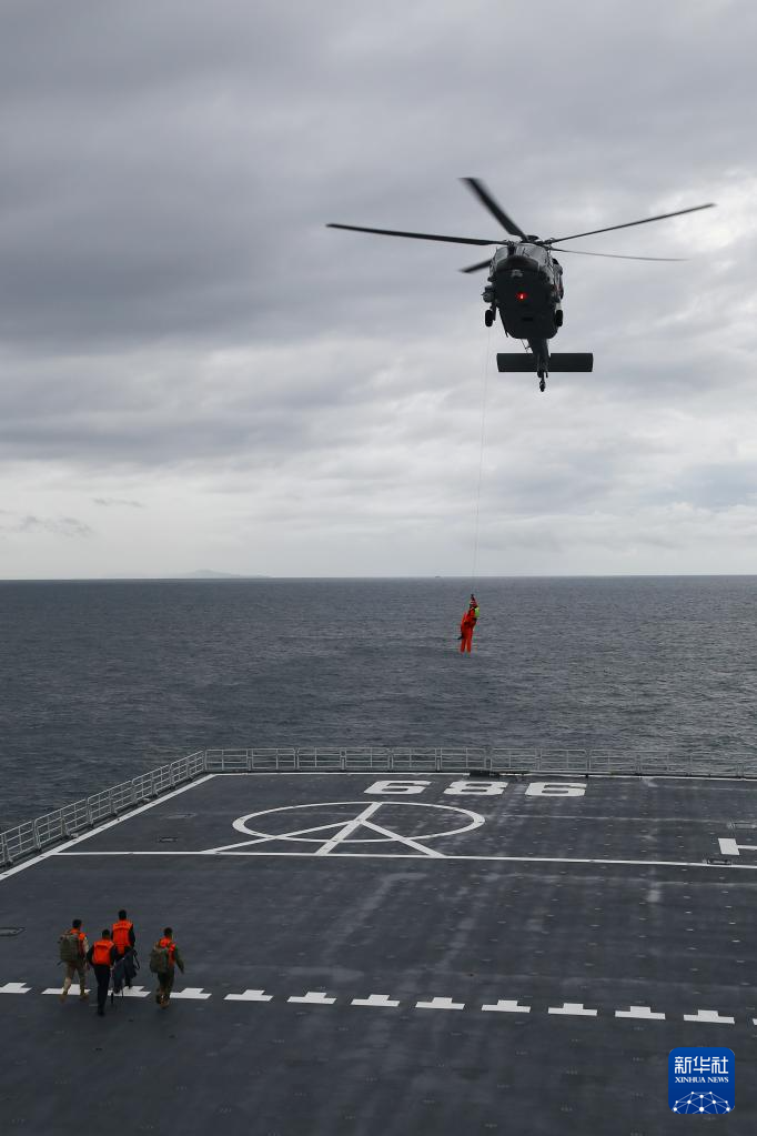 5月26日,中柬“金龙-2025”联演海空方向实兵演练在柬埔寨西哈努克港附近海空域举行,参演直升机将“伤员”转运至中国海军长白山舰。新华社发(甘俊 摄)
