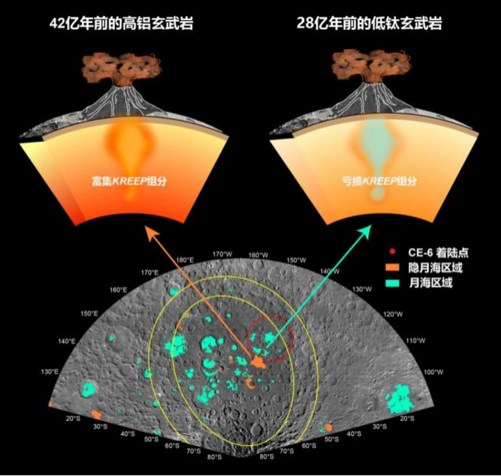 嫦娥六号月球样品记录的两期玄武质火山活动及其月幔源区性质示意图。(中国科学院供图)
